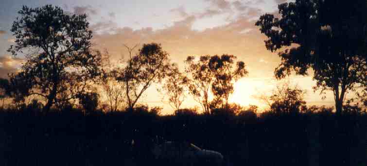 Nach diesem Geschäft und nachdem ich getankt habe, fahre ich auf den Caravan Park. Jede Stadt hat mindestens einen solchen CarPark. Mit nur 4 $ pro Mann, Zelt und Nacht ist man hier gern gesehen. Mein Zelt steht nach einer Viertelstunde. Weideland rund herum, Büsche, Bäume, ein Pferd am Weidezaun, Sonnenuntergang. Ein Aboriginal sitzt an seinem Auto und spielt Didgeridoo. Das ist das ganz normale Australien im Outback.