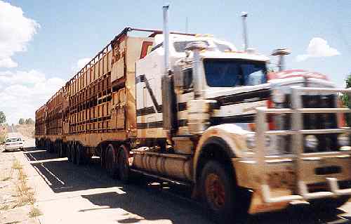Einmal bin ich bisher so einem Gerät begegnet: Es ist besser, man geht so weit wie möglich beiseite, denn diese harten Jungs gehen nicht mit dem Fuss vom Gas, und auf den Randstreifen weichen sie nur aus, wenn es überhaupt nicht anders geht. Jetzt ist mir auch klar, warum diese Trucks vorne solche Rammgitter haben: Auf der Strasse liegen tote Känguruhs und tote, zerfahrene Kühe. Tiere laufen über die Strasse, aber die Trucker denken nicht daran, auf die Bremse zu gehen. Sie können den Train wahrscheinlich wirklich nicht so schnell bremsen.