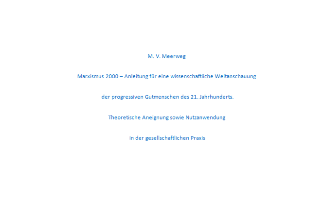 Spezielle Irrtümer sozialistischer Ideologen. ‚Das Kapital‘ hat in der DDR kaum jemand gelesen, ganz gewiss auch nicht die führenden Machthaber der DDR. Ich gebe zu, dass ich selbst Jahre gebraucht habe, um die drei dicken Bände wenigstens einmal durchzulesen. Aber das hat niemand von mir verlangt, und jene, denen ich das erzählt habe, waren sehr erstaunt. Wie eine Bibel gelesen – soll wohl heißen, dass die Bibel auch keiner mehr liest? Dass in der DDR „niemand“ danach fragte, wie sich der Kapitalismus in der BRD seit der Währungsreform von 1948 und dem Beginn des Wirtschaftswunders entwickelt hat, kann nur daran liegen, dass es alle wussten. Und gerade die Herrschenden fragten dauernd danach, wie sich der Kapitalismus entwickelt. Das weiß ich nun definitiv. Sie interessierten sich viel mehr dafür als für die Entwicklung in irgendeinem sozialistischen Land. Gern hätten sie ihr „hochgeheimes“ Herrschaftswissen sich allein vorbehalten. Aber: Keine Chance. Die DDR-Bevölkerung war nicht dumm und konnte auf keine Weise verdummt werden. Auch nach den Ursachen für den technischen Vorsprung des Westens wurde von allen Seiten – von oben und von unten – gefragt. Das war auch gar nicht verboten. Die Staatssicherheit wurde auf diese Frage angesetzt, und sie hat genug erfahren, was die DDR hätte voranbringen können. Aber die VEB waren nicht in der Lage, diese technischen Erkenntnisse in die Produktion zu überführen. Man versuchte es ja, auf legale Weise zu machen, weil man den zollfreien Innerdeutschen Handel - den sogenannten Swing - nicht gefährden wollte. Das gelang aber nur mit teuren kapitalistischen Lizenzen, wie zum Beispiel aus Frankreich im Erdölverarbeitungskombinat Schwedt. Die Sowjetunion behandelte die DDR, was die Weitergabe von technischem Wissen anbelangt, fast wie ein Feindesland, schöpfte selbst aber unmittelbar vor Ort in den Betrieben alle Betriebsgeheimnisse ab. Marx ist klar, dass die Bourgeoisie nicht freiwillig die Macht hergeben wird. … Der Begriff ‚Diktatur des Proletariats‘ stammt aber nicht von Marx, sondern von Lenin. „ …“ (Staat und Revolution, Teil II). … DDR heißt Deutsche Demokratische Republik. Die DDR war aber weder demokratisch noch ein Republik, sie war immer eine Diktatur der Sozialistischen Einheitspartei (SED). Auch offiziell wurde immer von der Diktatur des Proletariats gesprochen. Die führende Rolle der Partei der Arbeiterklasse war sogar in der Verfassung der DDR festgeschrieben. … Ständige Präsenz massiver Gewalt, intellektuelle Bevormundung, flächendeckende Bespitzelung bis hin zu scheindemokratischen Spielchen und den peinlichen Wahlfälschungen. … Ich stimme allem hier Gesagten uneingeschränkt zu. Die Wahlfälschungen waren aber nicht „peinlich“, sondern auch nach DDR-Recht illegal. Sie waren im höchsten Grade verbrecherisch und wurden zu Recht nach der „Wende“ bestraft. In der marxistischen Theorie hat der Begriff „Diktatur des Proletariats“ künftig keinen Platz mehr. Er ist ersatzlos zu streichen. Aber sogar von einer führenden Rolle der Arbeiter in einem postkapitalistischen demokratischen Staatswesen kann in der marxistischen Theorie keine Rede mehr sein. In dem historischen Augenblick, als in Polen, in der Sowjetunion und andernorts Arbeiter gegen die sozialistische Staatsmacht zu streiken begannen, sind sie bereits ins politische und sozialökonomische Lager der Bourgeoisie übergegangen. Diese streikenden Arbeiter hatten und wussten keine andere Alternative zum bestehenden Staatseigentum als eben dessen Privatisierung. Es war ihnen zumindest völlig egal, wer der Eigentümer des Betriebes ist, in dem sie bisher gearbeitet haben. Sie wollten mehr Lohn – und hätten dafür auch einen Staatsbankrott in Kauf genommen. Diese Arbeiter verhielten sich ihrem damaligen Staat gegenüber illoyal. Sie erkannten ihn nicht mehr als ihren Staat an. Damit wurden sie zum Totengräber des real existierenden Sozialismus – und nicht etwa des Kapitalismus, wie es noch in der Marx’schen Theorie vorgesehen war. Das Streikverhalten der Arbeiter ist historisch-gesellschaftliche Realität. Die marxistische Theorie muss also geändert werden. Damit steht so gut wie fest, dass der Kapitalismus künftig nicht mehr am Klassenkampf der Arbeiter scheitern wird. Aber das ist ja nichts prinzipiell Neues in der Geschichte. Auch die Sklavenhalterordnung ist nicht vorrangig am Klassenkampf der Sklaven gescheitert, der Feudalismus nicht vorrangig am Klassenkampf der Bauern, jetzt eben auch nicht mehr der Kapitalismus am Klassenkampf der Arbeiter. Die Weltgeschichte findet einen anderen Weg, den Marx und Engels noch nicht sehen konnten. Über ein Drittel der Zeitspanne, in der die kapitalistische Gesellschaftsformation bisher existiert, liegt nach der Veröffentlichung des Kommunistischen Manifests. Das war die Geburtsurkunde der revolutionären kommunistischen Arbeiterbewegung. Im Jahre 1989 haben die mutigen Montagsdemonstranten in der Stadt Leipzig in der DDR dem Realexistierenden Sozialismus in Europa die Sterbeglocke geläutet. Ihr beharrlicher Widerstand führte am 9.Nobember 1989 zu dem unvergesslichen Volksfest auf der Berliner Mauer. Es wurde aber vergessen, der revolutionären kommunistischen deutschen Arbeiterbewegung ihren Totenschein auszustellen. Hiermit unterschreibe ich im Namen der deutschen Marxisten diesen Totenschein, datiert auf den 21. April 2013. M. V. Meerweg Die Kaderpolitik Dialektischer und Historischer Materialismus haben den Untergang des Real existierende Sozialismus nahezu unbeschadet überlebt, wenn man davon absieht, dass die Arbeiterklasse als Hauptmotor der gesellschaftlichen Evolution nunmehr ausgeschieden ist und dass es keine geschichtsmächtige revolutionäre Partei der Arbeiterklasse mehr geben wird. Die Geschichte hat das theoretische Schaffen von Marx und Engels bis 1859 abgearbeitet. Die Marxisten des 21. Jahrhunderts konzentrieren nunmehr ihre ganze Kraft auf di