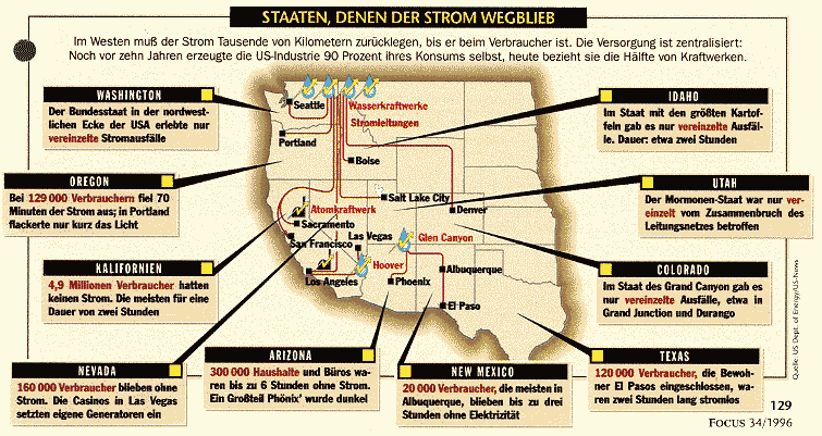 Stromausfall an der Westküste der Vereinigten Staaten. Vorgestern. Stundenlang kein Strom, Panik in stecken gebliebenen Aufzügen, Geschäfte werden geplündert, große Verluste bei Industriebetrieben. Eine Woche vorher: Totaler Zusammenbruch der Stromversorgung in Malaysia. Ein Kraftwerk fällt wegen Havarie aus, alle anderen Kraftwerke des Landes schalten sich aus Solidarität auch ab. 16 Stunden Chaos, besonders in den großen Städten. Millionenverluste der Wirtschaft. Die Strommanager in Deutschland betonen, dass das (Achtung: Das erste Mal neue Rechtschreibung !) bei uns natürlich nicht vorkommen kann. Wir haben ein internationales Energie Verbundsystem, die anderen nicht. Als ich in der vergangen Nach aufstand, um vom Balkon in den Himmel zu sehen stellte ich fest, daß meine dunkle Wohnung illuminiert ist: Überall leuchten rote und grüne Lämpchen. Geräte im Standby Modus! |