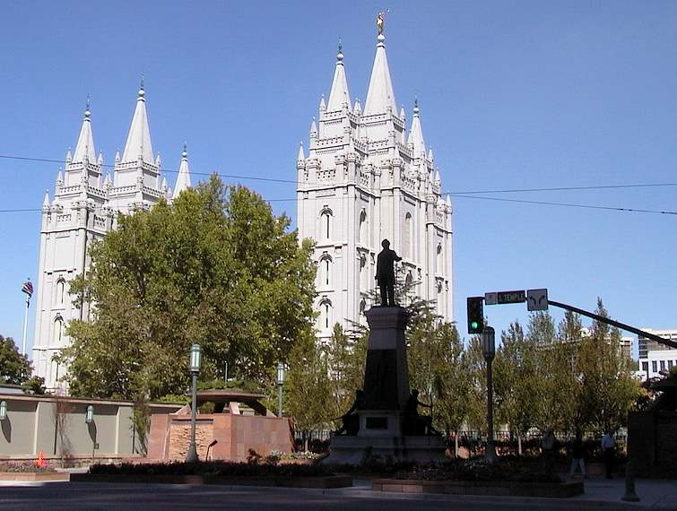 Am Morgen fahre ich von Evanston aus in einem Ritt bis nach Salt Lake City, denn das sind nur 140 km. Die Strasse geht stetig bergab und sie führt durch einen engen Canyon. Dieser Canyon hat Geschichte, denn hier sind die ersten Mormonen im Jahr 1847 mit ihrem Treck durchgezogen und haben ZION, das Gelobte Land erreicht. Der Canyon ist tief, er hat steile Sandsteinwände und er endet mit dem richtigen Finale: Nach einer sehr engen und tiefen Stelle der Schlucht geht es nach oben und der Blick weitet sich: Vor meinen Füssen liegt das breite, sonnige Tal von Salt Lake City. Salt Lake City wurde von den Mormonen gegründet, ist von ihnen geprägt und ist auch heute noch ihre Stadt. Der Gouverneur von Utah ist ein Mormone und die gesamte Verwaltung dieses Bundesstaates der USA wird unbestritten von Mormonen dominiert. NEWSWEEK, September 10, 2001, liefert auf Seite 46 exakte Zahlen. Der Temple Square