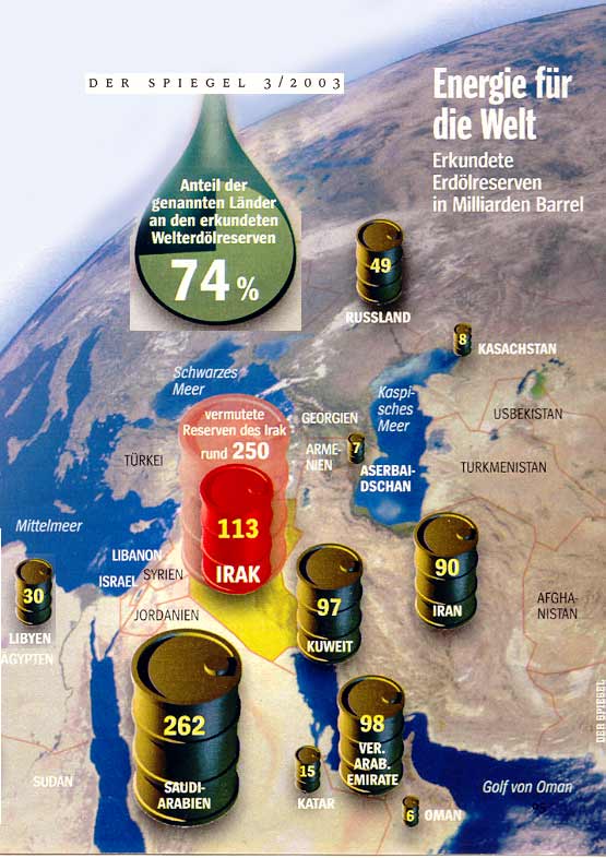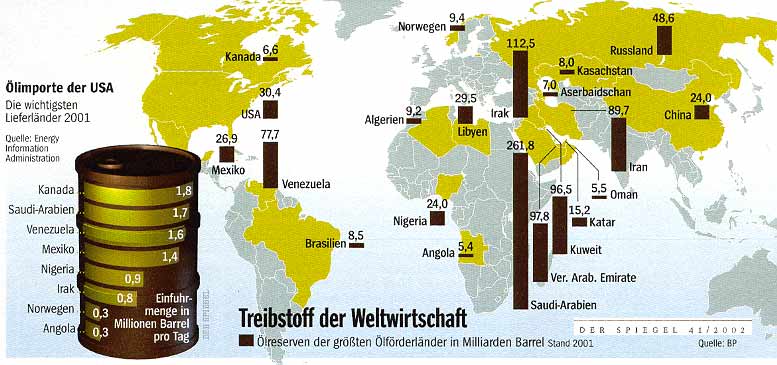 oder Öl ? Um an die Ölreserven am kaspischen Meer heranzukommen, haben die USA nach dem 11. September 2001 (endlich!!) Militärstürzpunkte in vielen Ländern Mittelasiens errichtet. Ehemals die Einflusssphäre der Sowjetunion. Afghanistan wird 'umgebaut' (nation-building). Ölkonzerne kaufen Warlords und mittelasiatische Despoten im Auftrag ihrer Regierungen. Die Menschenrechtsverletzungen im Irak interessieren die USA nicht. Sie werden durch die Embargopolitik der USA sogar verschärft. Die angeblichen Massenvernichtungswaffen Saddam Husseins sind nur ein propagandistischer Vorwand. Deutlich daran erkennbar, dass die USA das Angebot des Irak (vom 17.09.02) zur uneingeschränkten Rückkehr der Waffeninspekteure der UNO umgehend strikt abgelehnt haben. So klar ist die US-Administration schon auf den Krieg gegen den Irak fixiert. Seit Jahren wird die Lufthoheit des Irak durch Flugverbotszonen eingeschränkt, in denen amerikanische und britische Kampfjets 'operieren' - ohne UNO-Mandat. De facto hat der Irak Krieg längst begonnen. George W. Bush hat in Texas selber Geld mit Öl verdient. Die amerikanische Ölindustrie hat mit umfangreichen Spenden seine Wahl zum US Präsidenten unterstützt. Dieser US-Präsident versteht etwas vom Öl. Analysis: