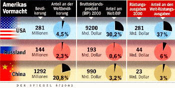 Im Nahen Osten ist zu beobachten, was Amerika unter dem Krieg gegen den Terrorismus versteht. Das brutale Vorgehen Israels gegen seine Nachbarn zeigt exemplarisch, wie die amerikanische Diktatur in ein paar Jahren global funktionieren könnte: Der Stärkere benutzt skrupellos seine Macht und hat immer auch das Recht und die Medien auf seiner Seite. Warum besteht die Geschichte der menschlichen Zivilisationen aus einer Kette von Dynastien, Kaiserreichen und Diktaturen? Wäre es nicht Amerika, so würde ein anderer Staat die Weltherrrschaft anstreben. Das scheint gesetzmässig zu sein: