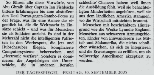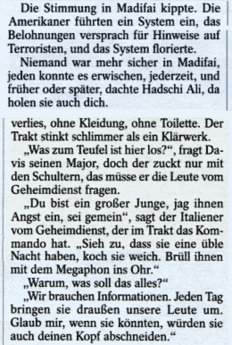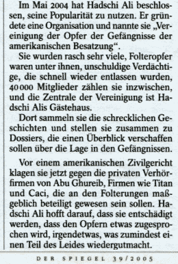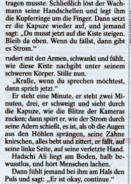 Ein erschütternder Artikel im SPIEGEL 39/2005: Der Kapuzenmann. Ohne den erhobenen Zeigefinger wird das Leben eines Irakers dem eines amerikanischen Soldaten gegenübergestellt. Beide wollen nichts anderes, als leben und in Ruhe gelassen werden. Eine absurde Politik sorgt dafür, dass sie im Irak aufeinander treffen. Das Bild des Irakers ging als Kapuzenmann um die Welt. Allein 40.000 Folteropfer haben sich in der "Vereinigung der Opfer der Gefängnisse der amerikanischen Besatzung" zusammengeschlossen. Sechs Soldat wurde bisher wegen Misshandlung von Gefangenen verurteilt und unehrenhaft aus der US-Armee entlassen. Niemand glaubt Amerika das Fehlverhalten einzelner Soldaten. Es wird mit System gefoltert. In jedem Krieg und seit Menschen Krieg gegeneinander führen. Gib dem Menschen Macht - unbeschränkt und unkontrolliert - und er wird zum Tier. Und weil das so normal und selbstverständlich ist, sind Folter und gravierende Menschenrechtsverletzungen durch die USA weder ein Thema für den deutschen Aussenminister noch bei der UNO-Vollversammlung. Nur im Internet ist Folter unübersehbar präsent: 318.000 Dokumente unter dem Stichwort "Folter Irak".