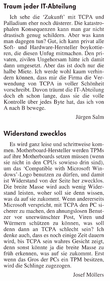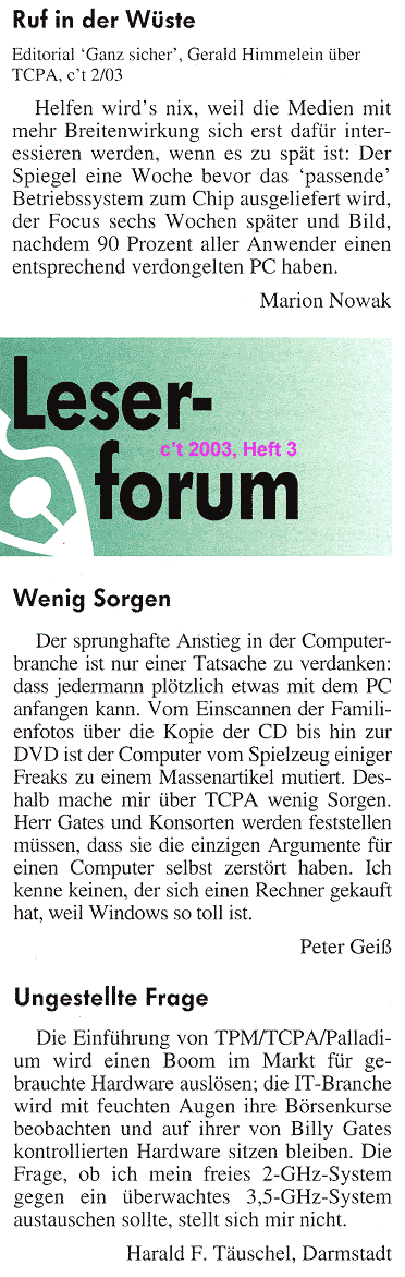 Diskussionen über den Leitartikel zu TCPA c't 2003, Heft 3, Seite 10