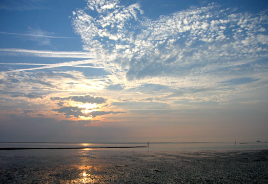 Sonne, Watt und Meer vor und hinter dem Deich. Schöne