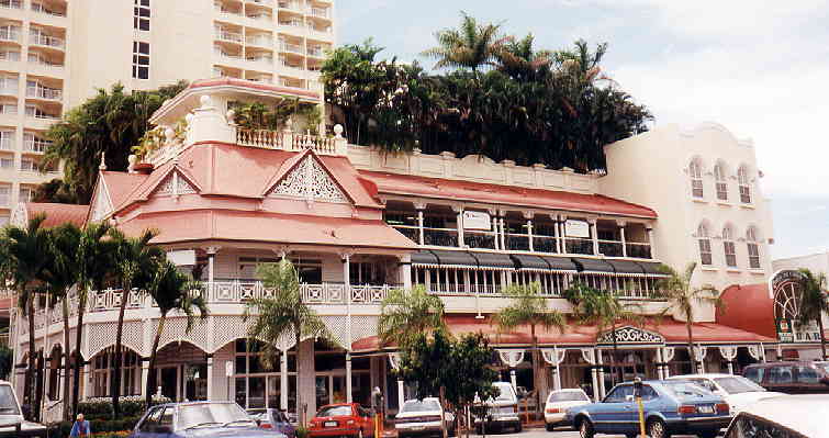 Ich habe versucht herauszubekommen, ob es in Cairns eine Kunstschule gibt. An einem alten Gebäude in der Innenstadt steht die Inschrift School of Art. Das war einmal. Jetzt ist in diesem Haus das Heimatmuseum untergebracht. Ich habe es besucht. Es ist etwas besser, als die bisherigen Museen, aber auch ziemlich lieblos und unsystematisch eingerichtet. Auch hier gibt es wieder viele Fotos aus der Pionierzeit, die sehr interessant sind. Die Zeit, die sie so lebendig zeigen, liegt erst 80 bis 100 Jahre zurück, aber sie ist mit der heutigen überhaupt nicht mehr vergleichbar. Was muss das für ein schweres Leben gewesen sein! Wenn man sieht, wie damals die Männer im Regenwald den riesigen Bäumen nur mit der Axt zu Leibe gegangen sind, das ist kaum noch vorstellbar: Diese Bäume hatten 3 bis 5 Meter Durchmesser und Brettwurzeln, die aus riesigen Flächen bestanden! Sie haben erst Löcher in den unteren Stamm gehauen, haben dort Trittstufen hinein geschlagen und sich so bis in eine Höhe von ca. 5 bis 8 Metern hoch gearbeitet. Dort oben haben sie eine Galerie gebaut und mit dem Fällen des Baumes begonnen: Die Axt war dafür das einzige Werkzeug! Auf diese Art haben sie die gewaltigen Brettwurzeln umgangen, die das Fällen des Baumes weiter unten offensichtlich unmöglich gemacht haben. War der Baum gefallen, wurde er in 10-Meter-Stücke gesägt, die dann mit Ochsengespannen (ohne Wagen !) aus dem Regenwald geschleift wurden. Später wurden dafür auch Schienen gelegt und Eisenbahnloren eingesetzt. Die Sägewerke wurden mit Dampfmaschinen angetrieben. Auf diese Weise wurde viel Holz gleich an Ort und Stelle verheizt ...! Aus Mahagoni wurden Bretter und Bohlen gesägt: Das ganz normale Bauholz in den Tropen. Und das alles ist keine 100 Jahre her. Diese wenigen Jahre aber haben gereicht, um ganze Arbeit zu leisten: Jetzt ist nirgends mehr auch nur ein solcher grosses Baum zu sehen.