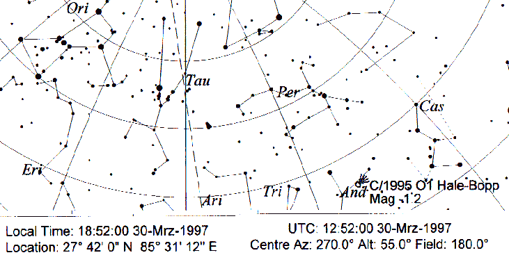 HURRA !! HALE-BOPP GESEHEN !!! Das ist ja ein irres Ding: Nach dem Essen es war fast genau 19 Uhr ging ich auf's Dach um zu sehen, was das Wetter macht. Gewitter im Osten. Weit weg. Über uns im Zenit einige Sterne. Es ist noch schwach zu sehen, wo die Sonne untergegangen ist. Ich suche Cassiopeia kaum zu sehen, noch zu hell. Aber da links davon, im hellen Himmel des Sonnenunterganges, was ist das für ein Stern? So hell mit einem schemenhaften Schweif? Kontrolle: Da ist der Orion und der rote Mars ist auch zu sehen das Ding ist doch nicht etwa Hale-Bopp?