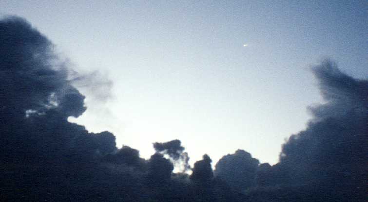 Was bin ich doch für ein Glückspilz! Habe ich doch schon wieder Hale-Bopp gesehen! Aber unter welchen Umständen! Gewitter: Zwei Gewitterfronten am westlichen Abendhimmel. Eine kommt von rechts, eine von links. In der Mitte bleibt ein Stück Himmel frei, dieses Guckloch wird aber immer kleiner. Und genau dort steht Hale-Bopp, gut zu erkennen, obwohl der Himmel noch sehr von der untergegangenen Sonne erhellt wird. Auf der rechten Gewitterwolke gibt es sogar noch Sonnenstrahlen. Ich mache mit 'B' ein Foto und zähle fünf Sekunden. Wenn dieses Foto gelingt, dann kann man sehen, was ich heute für ein Schwein mit Hale-Bopp hatte! Der Komet wird wahrscheinlich kaum zu erkennen sein, aber sicher die Wolkenlücke. Vielleicht ist auch Hale-Bopp zu sehen, denn zusammen mit Sirius und Mars war er einer der hellsten Sterne am Abendhimmel. { Das Foto ist erstaunlich gut geworden. Ich ließ den Film in der Khaosan Road in Bangkok entwickeln. Als ich die Fotos abgeholt hatte, setzte ich mich in ein Lokal, bestellte einen Juice und sah mir die Bilder an. Als ich das erste mal das Hale-Bopp-Foto sah, juchzte ich laut auf und klatschte in die Hände!! In der Khaosan Road fällt das nicht sonderlich auf.} Das alles spielte sich von 18:52 bis 19:05 ab. Dann hatte die Gewitterfront von rechts die Lücke geschlossen und den Kometen verdeckt. Aber er war so hoch, daß er sicher erst gegen 21 Uhr hinter dem Horizont verschwindet. Zeit genug, für jede Menge weitere Überraschungen!