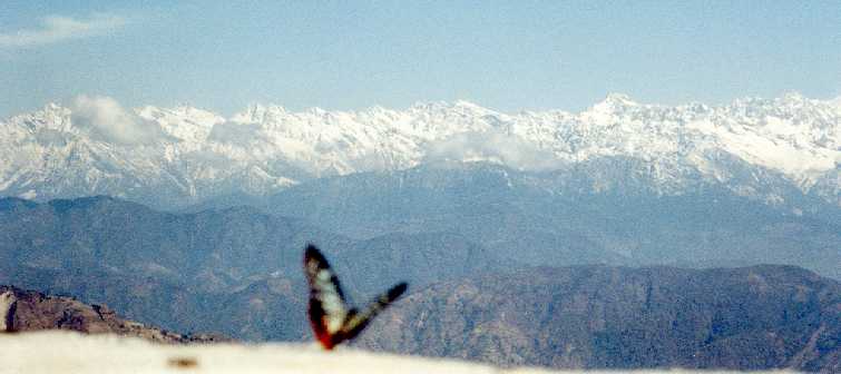 Um 5:45 bin ich heute aufgestanden, gleich zog ich mich an, obwohl ich schon sah, es ist keine Sicht. Als ich die Tür aufmachte: Regen! Nagarkot in der Wolke. Ich wollte mich schon wieder ausziehen da sah ich, daß man plötzlich 300 Meter weit sehen konnte. Also ging ich trotz Regen auf die Galerie unter dem Dach und sah mir an, wie die Wolken hier an diesem Berg vorbeizogen. Um 6:30 merkte ich, das Wetter wird sich in der nächsten halben Stunde nicht ändern. Also legte ich mich wieder ins Bett und schlief seit langer Zeit wieder mal bis kurz vor 9 Uhr. Dann ging ich ganz in Ruhe frühstücken, die Sicht wurde dabei immer besser. Unter den Wolken konnte man schon weit ins Land sehen. Gegen 11 Uhr die Reisegruppe aus Berlin hatte sich schon nach Kathmandu verabschiedet war das ganze Panorama der weißen Gipfel zu sehen, ca. 160 Grad. Allerdings mit Wolken dazwischen, aber die Bergkette lag im Sonnenlicht vor mir imposant und beeindruckend.