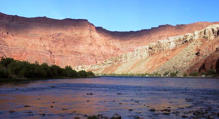 Grossvater steht im kalten Wasser und fischt: Eine Regenbogenforelle hat er schon. Vor dem einmündenden Flüsschen ist der Colorado klar, flach und breit. Ich laufe noch 250 Meter auf Steinen flussaufwärts. Dann habe ich die richtige Badewanne gefunden und leiste mir ein spezielles Vergnügen: Ich habe Waschlappen und Seife mit und wasche mich gründlich von Kopf bis Fuss in diesem kalten Wasser. Als ich die Haare wasche merke ich, wie viel Salz allein dort oben ausgeschwitzt wurde. Um 18:45 Uhr bin ich rechtzeitig zum Sonnenuntergang zurück. Wie lange habe ich es nicht mehr geschafft, den Sonnenuntergang im Liegestuhl zu bewundern und auf die ersten Sterne zu warten! Nie werde ich vergessen, wie ich das in Alice Springs genossen habe. Dort tauchten immer die 'Leitsterne' unter dem Southern Cross als erste Sterne direkt im Westen aus dem Sonnenuntergang auf. Australien wird mich nicht mehr loslassen! Aber Arizona ist wirklich Australia sehr ähnlich: Temperatur, Farben, Licht. Das ist erstaunlich, aber wiederum auch nicht: Wenn die Geologie, das Klima und die Umstände ähnlich sind, dann muss es auch ähnlich aussehen, denn es wirken ja die gleichen Naturgesetze.