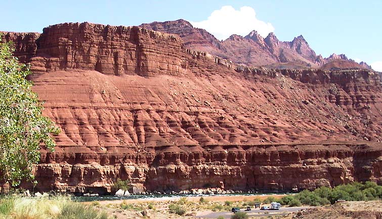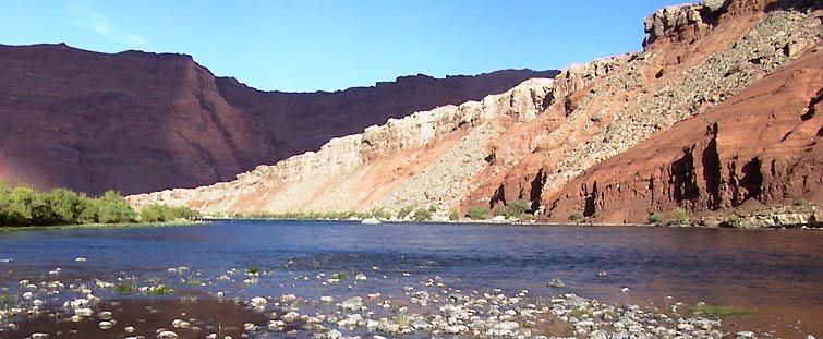 Nach der Begegnung mit den Bikern aus Holland fahre ich weiter nach Osten und erreiche bei Marble Canyon die Navajo Bridge. Von der hohe Brücke aus bewundere ich den Colorado, der hier braun und träge in einem schmalen Canyon fliesst. Obwohl es erst 15 Uhr ist, werde ich heute hier Station machen. In dem Shop an der Brücke erkundige ich mich, wo der nächste Campground ist und lande hier bei Lee’s Ferry. Von 1873 bis 1928 hat es hier eine Fähre über den Colorado River gegeben. Das Gebäude 'Lees Ferry Fort' haben 1874 Mormonen gebaut, um sich vor den Angriffen der Navajo zu schützen. Die Navajo betreiben heute den Shop an der Brücke und auch den Selbstbedienungs-Campground bei Lee’s Ferry. Auf diesem Campground sitzt man wie auf einem Aussichtsturm. Was für eine Landschaft, was für Bilder !! Vor mir rote, hohe Wände, unten der Colorado River, in dem ich dann baden gehen werde und rund herum in diesem Kessel nur rote, bizarre Sandsteinklippen. Hier fängt der Grand Canyon an. 20 Kilometer nach Osten liegt der Glen Canyon Dam. Der Colorado River wird aufgestaut, bevor er in den Grand Canyon fliesst. Bei Bullhead City, 150 km südlich von Las Vegas, also weit weg, liegt der Davis Dam, dort wird der Colorado River noch einmal gestaut. Ob das eine gute Idee war, diese Dämme zu bauen, wage ich zu bezweifeln. Der Schweiss tropft von der Nase und läuft an Bauch und Rücken herunter, nackt sitze ich vor dem Laptop. Ganz wie in Australien, das gefällt mir, so fühle ich mich wohl ... wenn es irgendwo eine Dusche gibt - hier fehlt sie leider, man muss runter zum Colorado River. Eine Stunde vor dem Sonnenuntergang versuche ich, im Colorado zu baden. Die erste Enttäuschung: Direkt unter dem Campground ist der River braun wie Kakao, hier kann man nicht baden. Die zweite Enttäuschung: Das Wasser ist sehr kalt, ich schätze, unter 10 Grad ??! Unten am Fluss ist auch die Lufttemperatur deutlich niedriger. Wie kommt das, warum ist das Wasser so kalt? Ich laufe stromaufwärts. Hier mündet ein kleiner Bach und hier haben sich Natives mit ihren Kindern niedergelassen, die im Schlamm herumtoben und entsprechend aussehen! |