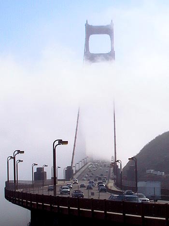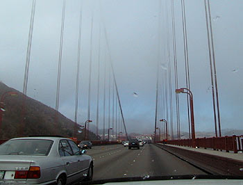 Auf der Südseite der Brücke liegt ein Parkplatz: Ein Schild: ’Letzte Ausfahrt vor der Brücke’. Dort stelle ich mein Auto ab und stecke Geld in die Parkuhr: 25 Cent pro 15 Min. Im Nebel laufe ich ein Stück auf die Brücke. Der Verkehr ist durch den Nebel nicht behindert, aber eine touristische Sehenswürdigkeit ist die Brücke heute nicht. Hier rechts unten müsste ich jetzt eine kleine Insel sehen: Alcatraz, die legendäre Gefängnisinsel. Noch weiter rechts die Nordspitze von San Francisco mit den Hafenanlagen. Das kann ich nur ahnen, tatsächlich ist nur eine graue Wand zu sehen.