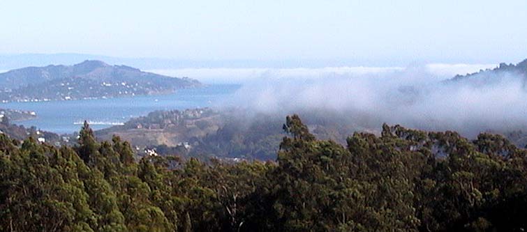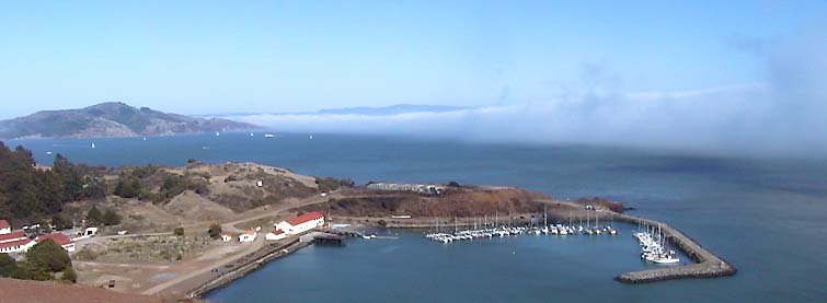 Unten liegt die See in der Sonne und die flache Nebelbank schiebt sich weit in die Bucht von San Francisco hinein.