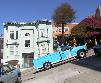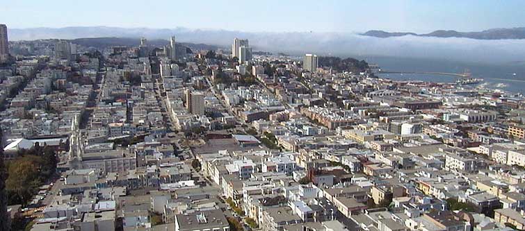 Dann will ich auf den Turm, den man schon bei der Einfahrt in den Hafen auf der rechten Seite auf einem Berg stehen sieht. Es ist der Coit Tower, der von einer Mrs. Lillie Hitchcock gestiftet worden ist damit sich alle Einwohner von San Francisco ansehen können, was sie für eine schöne Stadt haben. Man hat einen herrlichen Blick von da oben über die Stadt. Von hier aus könnte man auch die Golden Gate Bridge sehen (s.o.), wenn nicht immer noch der Nebel vom Pacific genau durch dieses Tal fliessen würde, das die Golden Gate Bridge überspannt.