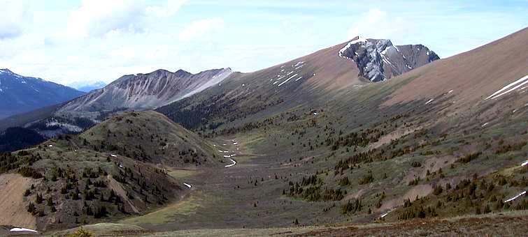 Je höher man steigt, desto deutlicher ist zu sehen, dass es sich hier um das Trogtal eines Gletschers handelt. Er ist erst seit ein paar tausend Jahren verschwunden. In der Sonne geschmolzen und abtransportiert über den Maligne River. Am Fuss des Troges liegen zwei kleine Hügel, die Opal Hills, die man auf dem Loop umrundet. Der Wanderweg zweigt nach rechts