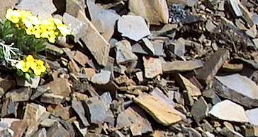 Die ganze 6 bis 8 Kilometer lange Flanke des Opal Peak besteht aus kleinen, scharfkantigen Schieferplatten, höchstens so gross wie ein Markstück, zwei bis 5 mm dick und braun! Auf diesem braunen Schieferschutt wandere ich weiter nach oben. |