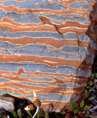Am meisten begeistern mit Felsen, Quadratmetergross glatt geschliffen und in 2 bis 10 mm dicken Schichten geschichtet in Schwarz und Ziegelrot!! Überall liegen diese Steine herum aber ich finde wieder nicht den 'idealen Stein'. Ich sammel aber einige auf und mache dann am Auto ein Foto davon. Das ist eine ganz eigenartige Schichtung, was war da hunderttausende von Jahren an dieser Stelle hier los?? Es muss ein turbulenter Meeresboden gewesen sein, die Schichten sind zwar waagerecht, aber sie sind nicht gleichmässig, der Meeresboden war nicht eben.