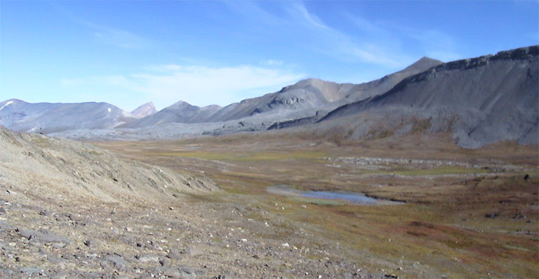 Das ehemalige, jetzt abgetaute Icefield am Wilcox Pass - rechts der Nigel Peak