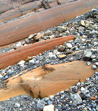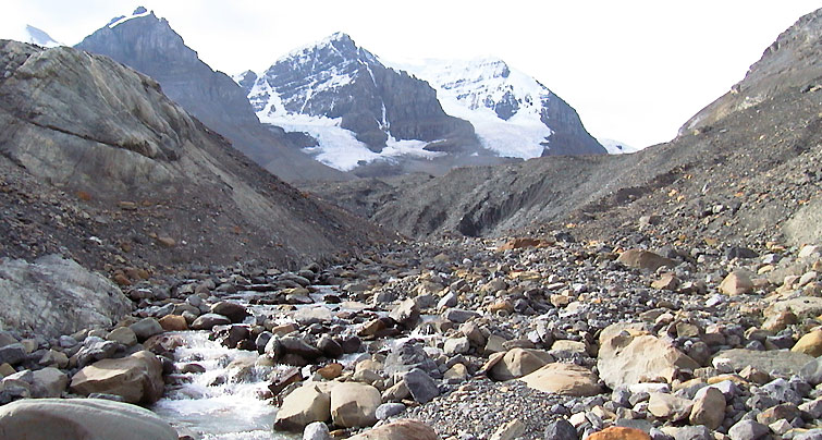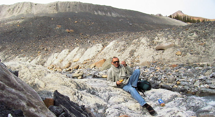 | Aber mir ist das zu gefährlich. Ein Ausrutscher kann genügen und ich liege mit einem lädierten Bein in dieser Steinwüste. Kein Mensch sucht nach mir und findet mich hier. So ein Jammer, dass ich alleine bin, ich wäre so gerne in dieses Tal des Dome Glaciers hoch gestiegen. Mich fasziniert diese Mondlandschaft aus Fels, Geröll, Wasser und Eis. Die Vernunft siegt und ich drehe um, steige die Schutthalde runter und überquere wieder den kleinen Gletscherbach, ohne mir die Füsse nass zu machen. Aus Dankbarkeit mache ich Frühstück auf einem glatt geschliffenen Felsen, der mir den Übergang ermöglicht hat. Hier sind seine Koordinaten: Latitude: 52° 12. 792' N Diese Stelle ist nur ein paar hundert Meter vom Parkplatz unten an der Gletscherzunge entfernt. Diesen Felsen gibt es mindestens noch bis zur nächsten Eiszeit. Also bitte: Jeder kann diese schöne Wanderung nachmachen, aber es sieht wesentlich einfacher aus, als es ist. Aber das interessanteste kommt noch, denn zurück zum Parkplatz muss man wieder den Berg hoch. Ein kleiner Fluss versperrt den direkten Weg. Was sieht man da oben: Kaum zu glauben, aber hier liegt wieder die Schicht mit dem schwarz-rot gestreiften Steinen, die ich vielleicht 600 m gegenüber an der Strasse schon gestern bewundert habe. hier hat sie der Gletscher blank geschliffen und - wenn er senkrecht zur Schichtung angegriffen hat - auch auseinander gerissen. Was das für Bilder sind! Vor allen Dingen sieht man Anschnitte in jedem Winkel und kann sogar den damaligen Meeresboden von oben sehen. Das Herz des Hobby-Geologen hüpft vor Freude! |