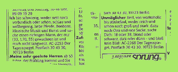 Die Kontaktanzeigen funktionieren natürlich auch nach den Gesetzen der Werbung. Das Angebot, das Produkt, wird in den schönsten Farben ausgemalt und dargestellt. Daß die Wahrheit dabei kaum eine Rolle spielt, ist besonders bei Kontaktanzeigen von Vermittlungsagenturen zu sehen, die schon nach drei bis vier Worten als solche zu erkennen sind. Wer privat eine Anzeige in die Zeitung setzt, traut sich nicht so unverschämt zu übertreiben und zu lügen, wie diese Institute. Es ist erstaunlich, daß die hinter diesen Anzeigen stehenden Frauen und Männern sich so offensichtlich überbewerten lassen. Auch stellt sich die Frage, warum eine junge, strahlende Frau aus den allerbesten Geschäftskreisen in Deutschland, die ständig zwischen Südostasien, Europa und den USA unterwegs ist, dabei nicht einen, auch nur halbwegs interessanten Mann trifft ?! Nein, sie findet ihn nicht und nun soll eine Anzeige im Berliner Tagesspiegel endlich die emotionale Leere ihres Herzens auffüllen! Aber das ist wie generell bei der Werbung: Sobald man sie rational analysiert stellt man fest, daß die Werbestory logische Fehler hat und daß keine sachlichen Fakten vermittelt werden. Es soll nur eine bestimmte emotionale Stimmung mit dem Produkt gekoppelt werden. Ein Feeling wird erzeugt, Schlüsselworte und Schlüsselbilder werden produziert. Genau so funktionieren auch Kontaktanzeigen. Es werden Signale ausgesendet, von denen man annimmt, daß sie eine bestimmte Zielgruppe sensibilisieren, von ihr verstanden werden. Wer nicht zu der Zielgruppe gehört (wie ich), dem und nur dem fällt auf, wie überspannt, unnatürlich und heuchlerisch sich da jemand präsentiert oder präsentieren läßt. Nie ist eine Masche völlig ausgereizt, es gibt immer wieder Steigerungen. Die Kunst der Moderne hat vor der Werbung das Prinzip 'Mache genau das Gegenteil von dem, was man erwartet' benutzt. Es stammt aus der Technik und heißt dort kinematische Umkehr: Wie hebe ich mich aus einer Menge von Leuten heraus, die alle behaupten, schön, tolerant, reich und lieb zu sein? Man behauptet einfach das Gegenteil. Es ist das erste Mal, daß ich solche Anzeigen im Tagesspiegel gesehen habe. Sicher ist diese Masche nicht ganz neu, aber im Tagesspiegel fällt das noch auf. Interessant ist auch, daß es heute gleich zwei solche Anzeigen gibt, eine von einer angeblich unleidlichen Ziege und die andere von einem nörgelnden Ossi. Aus meiner Sicht hat der Ossi überdreht. So etwas gibt es auch. Wer sollte bei diesem unmöglichen Kerl noch Lust verspüren, |