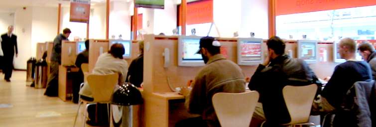 Kaffee und Kuchen gibt es auch und natürlich nicht umsonst, wie es z.B. in Australia vielfach üblich ist. Ein intelligentes, cleveres Konzept, das in den Hauptstädten Europas vermarktet wird. Die Schwachstelle liegt beim Personal. Man muss Schlange stehen, um ein Ticket zu kaufen oder aufzuladen, Sonderwünsche dauern lange und das angelernte Personal ist fachlich schnell überfordert. Aufpasser patrouillieren zwischen den vielen User'n. Sie haben den Charme und die Figur von Rausschmeissern. Fragt man sie etwas auf English, verstehen sie nur Bahnhof. Fotografieren ist verboten, macht man mir klar, obwohl entsprechende Schilder nicht zu sehen sind. Das Management hat die Illusion, die Berichterstattung über diesen Shop zensieren und das Fotografieren in diesen öffentlichen Räumen verhindern zu können. Mit der grossen Freiheit des Internets werden gute Geschäfte gemacht, gleichzeitig aber pocht man auf das antiquierte Hausrecht. Dabei braucht jeder nur die WebCam in die Umgebung zu halten, um Bilder aus dem Shop in die ganze Welt zu senden! Unbegreifliche Borniertheit. Reden kann man über dieses stupide Verhalten mit dem Chef vom Dienst nicht, seine Kompetenz ist schnell am Ende. Nicht er telefoniert wegen ein paar Fotos mit dem 'Marketing Manager Germany' in München, sondern ich soll das machen. Mehr als diese Empfehlung und die Email Adresse: andrea.m@easyeverything.com ist nicht zu erreichen. So sieht die typisch deutsche Kundenfreundlichkeit und der Service Made in Germany aus. Natürlich komme ich auch zu einem Foto, denn auch die gibt es im Internet. Hätte ich das Foto selber machen können, wäre es besser. |