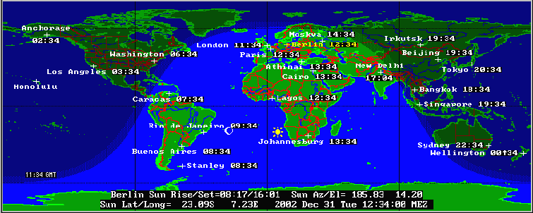 schöne Bilder auf dem Monitor und die Sache ist geklärt: Die Sonne projiziert einen Schatten auf die Erde. Die Front des Schattens zeigt, wo und wann die Sonne untergeht. Alle Sonnenuntergänge liegen auf dieser Linie. Bild 1. |