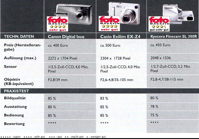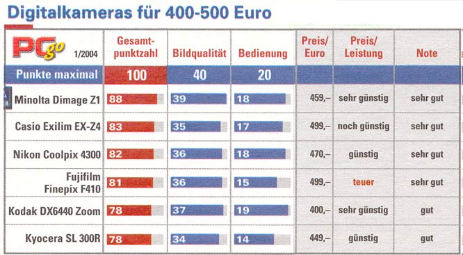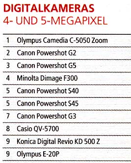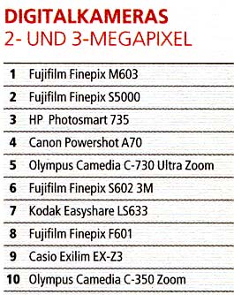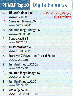 Top 10, Praxistests, Bestenlisten und vergleichende Bewertungen haben Konjunktur. Der Kunde soll zum Kauf animiert und vorher beraten werden. In allen Fachzeitschriften werden laufend Vergleichstests und Produktbewertungen durchgeführt. Auch in jeder Computerzeitschrift sind sie zu finden. ComputerBild beispielsweise führt in der aktuellen Ausgabe 1/2004 unter dem Stichwort 'Einkaufsführer' eine Bestenliste, in der mindestens 1.300 Produkte in ungefähr 200 Kategorien aufgeführt werden. Was sind solche Bestenlisten wert? Für die Digitalcameras am Ende des Jahres 2003 werden hier solche Bewertungen beispielhaft zusammengestellt (in Ausschnitten, s.u.). Die Auswahl ist zufällig und nicht repräsentativ, das Ergebnis aber ist eindeutig: Jede Zeitschrift stellt eine andere Camera auf das Siegerpodest, keine Bestenliste stimmt auch nur annähernd mit der der Konkurrenz überein. Der Kunde wird von selbst ernannten Fachleuten beraten, aber wehe, er testet die Bewertungen und Vergleiche: Sie sind nicht vergleichbar weil es sich in allen Fällen nicht um objektive Messungen, sondern um subjektive Bewertungen handelt. Urteilen Sie selbst: