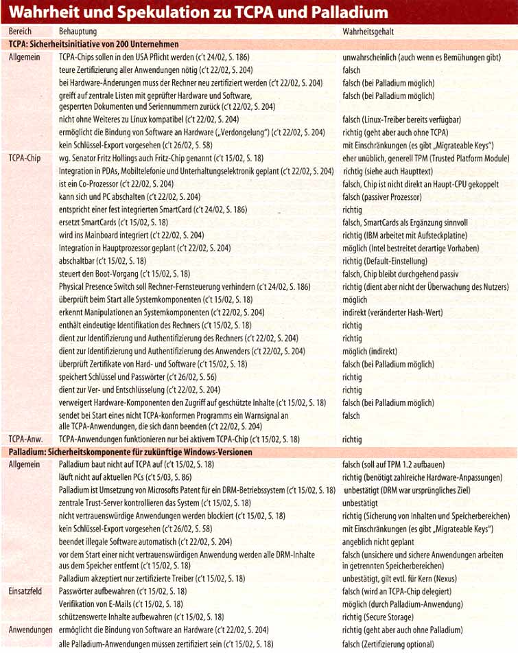 ist längst zu spät, das neue Copyright zu stoppen. Die Zeitschrift c't ist eine der wenigen Fachzeitschriften, die von Anfang an seriös über die drohende Beschneidung der Rechte der User berichtet hat. In einer Übersicht (s.u.) stellt c't im Heft 9/2003 dar, welche Behauptungen sich als Tatsachen erwiesen haben und wo man einer Ente nachgejagt ist.