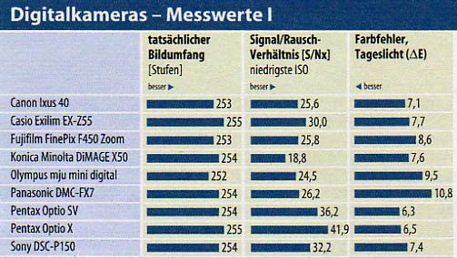 Aus diesem Bild ist zu erkennen, welche Cameras getestet wurden und wie es rauscht. Nach diesem Testbericht liefert die Sony die besten Fotos, sie besitzt auch den grössten Funktionsumfang. Ihr folgt die Casio, an der die fehlende Serienbildfunktion moniert wird. Die Panasonic ist eine interessante Camera, leider besitzt sie nur eine sehr kurze Akkulaufzeit. Zwei Pentax-Cameras und keine von Kodak und HP ... Warum? Trotzdem ein interessanter Testbericht mit dem Facit: Es gibt sie noch nicht, die wirklich empfehlenswerte, ultracompacte Digitalcamera!