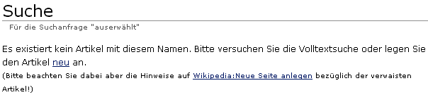 Am 10. Mai 2004 suchte ich nach 'auserwählt' und fand nichts. Wikipedia sagte mir: Das Stichwort existiert nicht. Legen Sie es neu an!! Das hatte so eine animierende Wirkung auf mich, dass ich am späten Abend die Stabstriche der Zusammenfassung der Story 'Auserwählt - aber beschränkt' unter 'auserwählt' eintrug.