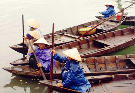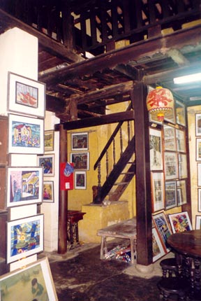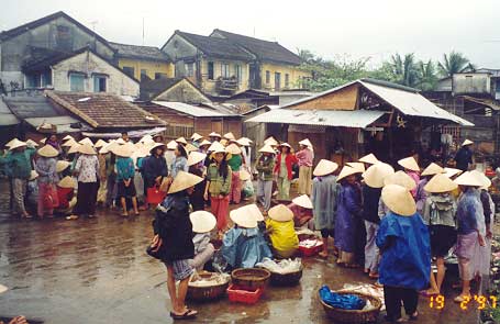 Holzhäuser, 100 bis 120 Jahre alt. Eine Art Gallery an der anderen. Alte Häuser, viele dem Verfall nahe, Moos, Schimmel und Flechten durch die hohe Luftfeuchtigkeit. In einem solchen Haus sehe ich, die Eingangszeichen an den Türpfosten sind Perlmutt-Einlegearbeiten. Ich frage, ob ich ein Foto machen darf. Die Mutter spricht English, die Tochter (15) ist sehr schüchtern, kann aber auch English. Sie führen mich durch das Haus, immer wenn ich frage, darf ich natürlich ein Foto machen. ‚Kommen Sie weiter!' und wieder öffnet sich eine Tür, ein neuer Raum, herrliche Holzarchitektur, ein Innenhof, überdacht von einem üppig wuchernden Buschwerk. Die ganze Zeit schon hört man dumpfe Trommelschläge vom gegenüberliegenden Ufer des Flusses. Die Frau erklärt mir, das ist eine Totenwache in einem buddhistischen Tempel. Zum Schluß öffnet sich die letzte Tür und wir stehen am Fluß. Ich bitte, ein Foto der Familie machen zu können, denn mit jedem Raum kamen mehr Menschen dazu. ‚Urahne, Großmutter, Mutter und Kind ...' Ein schönes Bild (hoffentlich). Ich bitte um die Visitenkarte und verspreche, einen Satz Bilder zurück zu schicken. Das habe ich dann von Hanoi aus auch getan. Danach laufe ich die Straße noch ein Stück weiter hinunter. Da wird es ländlich und ich gehe zurück. Ich suche die berühmten chinesischen Versammlungshäuser und finde sie nicht. Dafür gehe ich ins Keramikmuseum und anschließend noch einen neuen Weg über den undurchschaubaren Markt. Eine Marktfrau bietet mir an, Ginger zu besorgen (gerade habe ich mir davon Ginger-Tee gekocht, das geht!). Nach 10 Minuten ist sie wieder da und will für die gleiche Menge, die in Hue 5.000 Dong gekostet hat, 33.000 Dong haben. Handeln ist die erste Bürgerpflicht. Aber ich habe zu wenig Zeit und bezahle 20.000 für Mu't gung.