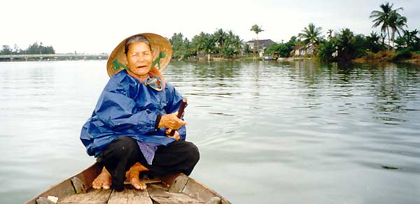 Am Hafen bieten sich überall ‚Wassertaxis' an. Schmale Boote, meistens von Frauen gerudert. Eine Stunde einen Dollar. Ich suche mir die älteste Frau aus, steige in das kipplige Boot. Die Frau sieht aus, als ob sie 80 Jahre alt wäre, wahrscheinlich aber ist sie mindestens 25 Jahre jünger. Schwarzer Mund mit Stummelzähnen: Sie kaut Cat. Sie sitzt am Heck des Bootes und paddelt langsam und gemächlich den Fluß hinunter. RUHE. Herrlich! Am Ufer geschäftiges Treiben, auf dem Fluß Taxis, Fähren, Sandtransporte, Fischer. Ich sehe in dieser Stunde nur noch ein einziges weiteres Boot mit Touristen. Bald greife ich auch selber zum Paddel. Ich kann es noch und erinnere mich an meine Blechboote in Salzwedel, 1947, Benzinkanister von Kriegsflugzeugen. Auf die Dauer ist das Paddeln ungewohnt und schwer, wenn ich nicht aufpasse, bekomme ich Blasen an den Händen. Die Oma sagt nicht viel, das ist gut, ich will meine Seele baumeln lassen. Außer o.k. kann sie kein English. Ich darf sie fotografieren. Sie bietet mir ihre Cat-Schüssel an. Nein Danke, aber ich fotografiere ihre heutige Cat-Ration. Dann ist die Stunde um und ich lasse mich an einem Bootssteg in der Nähe des Hotels absetzen. Ich habe keine 10.000 Dong, sondern nur einen Schein im Wert von 20.000 Dong . Mir ist klar, was jetzt passiert! Das Mienenspiel der Alten, als ich die Hälfte davon wieder zurück haben will! Ein Ausdruck zwischen Hoffnung und großer Enttäuschung. Kein Wechselgeld. Natürlich nicht. Ich gebe bald auf, denn die Situation ist ziemlich aussichtslos, wer wechselt mir hier diesen Schein?! Sie freut sich über das ganze Gesicht und mit vielen guten aber unverständlichen Worten werde ich verabschiedet.