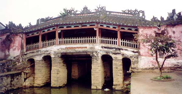 Ein letzter Spaziergang in Hoi An. Häuser, denen die Luftfeuchtigkeit schwer zusetzt. Die Tempelbrücke. Gleich dahinter eine kreative Konstruktion: Mit weniger Material kann man eine Treppe kaum bauen. Für Scharno machen ich ein Foto. Er ist begeistert, denn das ist seine Welt. Wieder im Hotel angekommen, packe ich meinen Rucksack. Scharno taucht auf. Er war mit dem Fahrrad noch einmal an der Beach. Er ist high und begeistert, weil er im Pazifischen Ozean gebadet hat und redet pausenlos. Das Wasser war 25 Grad warm - das typische Seeklima, Wasser- gleich Lufttemperatur, weil ... wieder folgt eine lange Geschichte. Auf alle Fälle fand auch er heute Morgen Ruhe und Entspannung. Eine kleine Story von der langen Geschichte, die er erzählte, ist typisch für dieses Land und seine Menschen: Nur eine von sehr vielen Bretterbuden am Strand hatte auf, schließlich ist keine Saison. Die Inhaberin (40) hatte es Scharno sofort angetan (Lisa war leider nicht zu sehen). Sie paßt auf seine Sachen auf, während er schwimmen geht, sie verkauft ihm etwas Essen, sie schäkern zusammen und zum Schluß ... gibt sie ihm ihre Visitenkarte: ‚Besuchen sie das Restaurant Nr. 6 an der Beach von Hoi An und empfehlen sie mich in Europa weiter!' Herrlich. Visitenkarten hat hier jeder, sie sind ein ganz wichtiges Statussymbol. Wir packen unsere Sachen, gehen noch einmal Essen, warten auf die bestellte Taxe und fahren um 12:15 mit einem schrecklich klapprigen Ersatzauto los, denn die Taxe kommt nicht. Marke und Baujahr dieses Autos ist nicht mehr feststellbar. Aber es fährt und wir erreichen für 10 Dollar den Flugplatz von Danang. Von Danang haben wir nicht viel gesehen, wir haben aber auch nicht viel verpaßt. Auf dem Flugplatz wird alles zügig abgewickelt, der Airbus A 320 ist halb leer. Ich hatte organisiert, daß wir beide einen Fensterplatz hatten. So hatten wir beide einen schönen, ruhigen Flug durch ein Tiefdruckgebiet (Scharno) mit dichter Wolkendecke. Schon 20 Minuten nach der Landung in Hanoi sitzen wir um 15:30 in dem Transferbus, der uns in die Stadt bringt. Auf dem Heimweg gehen wir beim Fotolabor vorbei und bringen die Filme weg. Scharno ist heute nicht in Form, er findet weder Film noch Geld. Ich hole jetzt die bestellte Software-CD für 50 Dollar ab, sie ist fertig, auch der entdongelte PageMaker ist jetzt in Hanoi wieder verfügbar! Zwei Stunden Ruhepause sind vorbei und wir gehen eine der berühmten Hanoier Suppen essen. So eine Pho haben wir vermißt. In der Mitte von Vietnam gibt es solche Suppen nicht, so kocht man nur in Hanoi! Die Suppe war gut, aber es war keine Pho. Eine dunkle Brühe, aus der Hühnerbeine guckten, abgefüllt in aufgeschnittenen Cola-Dosen. Mich interessierte einfach, was das ist und wie es schmeckt. Es wird warm gemacht und in eine Schüssel gegossen. Eine schmackhafte, dunkle Brühe, darin Seegras oder Tang (sehr fein, lang und dunkelgrün)? Ich wollte Reis dazu haben, damit es eine richtige Suppe wird. Die Chefin gab mir Reis in einer separaten Schüssel- der Kunde ist König - aber offensichtlich gehört Reis gerade nicht zu diesem unbekannten Gericht. Es hat gut geschmeckt, aber mit unseren schlechten Sprachkenntnissen war nicht festzustellen, was es war. Anschließend sind wir eine Stunde bei Van und Lan. Die Reise wird ausgewertet und wir bereiten uns auf morgen vor, denn dann soll an der Hochschule die Organisation unserer Lehrveranstaltungen festgelegt werden. Ich dränge zum Aufbruch, ich will Van nicht so viel Zeit stehlen. Auf dem Nachhauseweg entdecken wir durch Zufall - wir gucken an den eklektizistischen Hausfassaden hoch - den Mond!! Das erste Mal ist in Vietnam der Mond zu sehen! Es ist nicht mehr weit bis zum Vollmond, er steht hoch im Zenit. Jetzt wird klar, woher gestern die hellen Flecken am Nachthimmel in Hoi An kamen. Der Mond guckt nur kurzzeitig durch die Wolken, dann ist das schöne Schauspiel wieder vorbei. Glück gehabt.