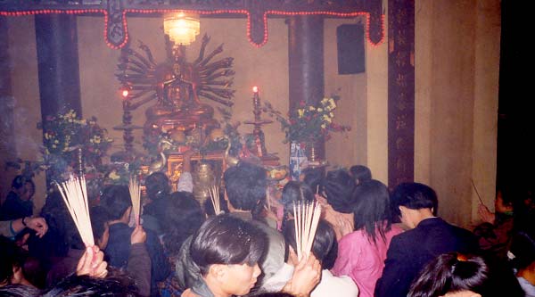 Nach dem Essen will uns Van unbedingt zeigen, was an diesem Tag in den Pagoden von Hanoi los ist. Wir besuchen drei oder vier Pagoden, Scharno mit Video, ich mit Kamera. Himmel und Menschen und tatsächlich ist heute abend über Hanoi auch der Vollmond zu sehen, vereinzelt sogar die Sterne. Immer noch gibt es Wolken am Himmel, aber dazwischen auch große Löcher. Mir fällt es schwer, alles was ich sehe aufzunehmen, ich habe zu viel gegessen und bin müde. Als wir auf dem Rückweg unsere Rucksäcke bei der Familie wieder abholen, muß noch Bambustee getrunken werden - die Frauen sitzen vor AutoCAD und haben viele Fragen - aber ich muß jetzt nach Hause, Schreiben und packen soll ich ja auch noch, denn morgen ziehen wir um! Also laufen wir, gefolgt vom Vollmond, zu unserem Hotel Elegant. Schrecklich viel los auf der Straße, immer noch alles voller Mopeds, viel Verkehr und viel laut. Endlich sind wir im Hotel. Es ist 23 Uhr, als ich mit meinen Notizen fertig bin und ich steige auf's Dach: Der helle Vollmond fast im Zenit! Als sich die Augen an die Dunkelheit gewöhnt haben, denke ich: Dieser helle Stern, er funkelt doch so wie der Sirius?! Ich peile, suche, gucke und tatsächlich: Aus dem Dunst der hohen Wolken taucht der Orion auf: Die vier äußeren Sterne des Orion und die drei aus dem Fragezeichen - sie verweisen direkt auf den Sirius. Der Orion liegt ca. 30 Grad schräger als in Europa, der Sirius sehr hoch, er blinkt fast genau auf der Höhe von 45 Grad. Sooo etwas Schönes schenkt man mir zum Geburtstag!